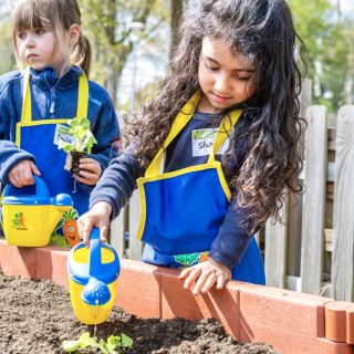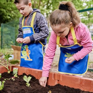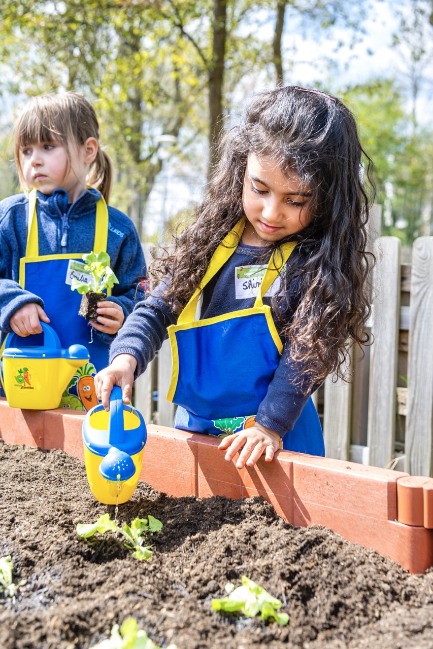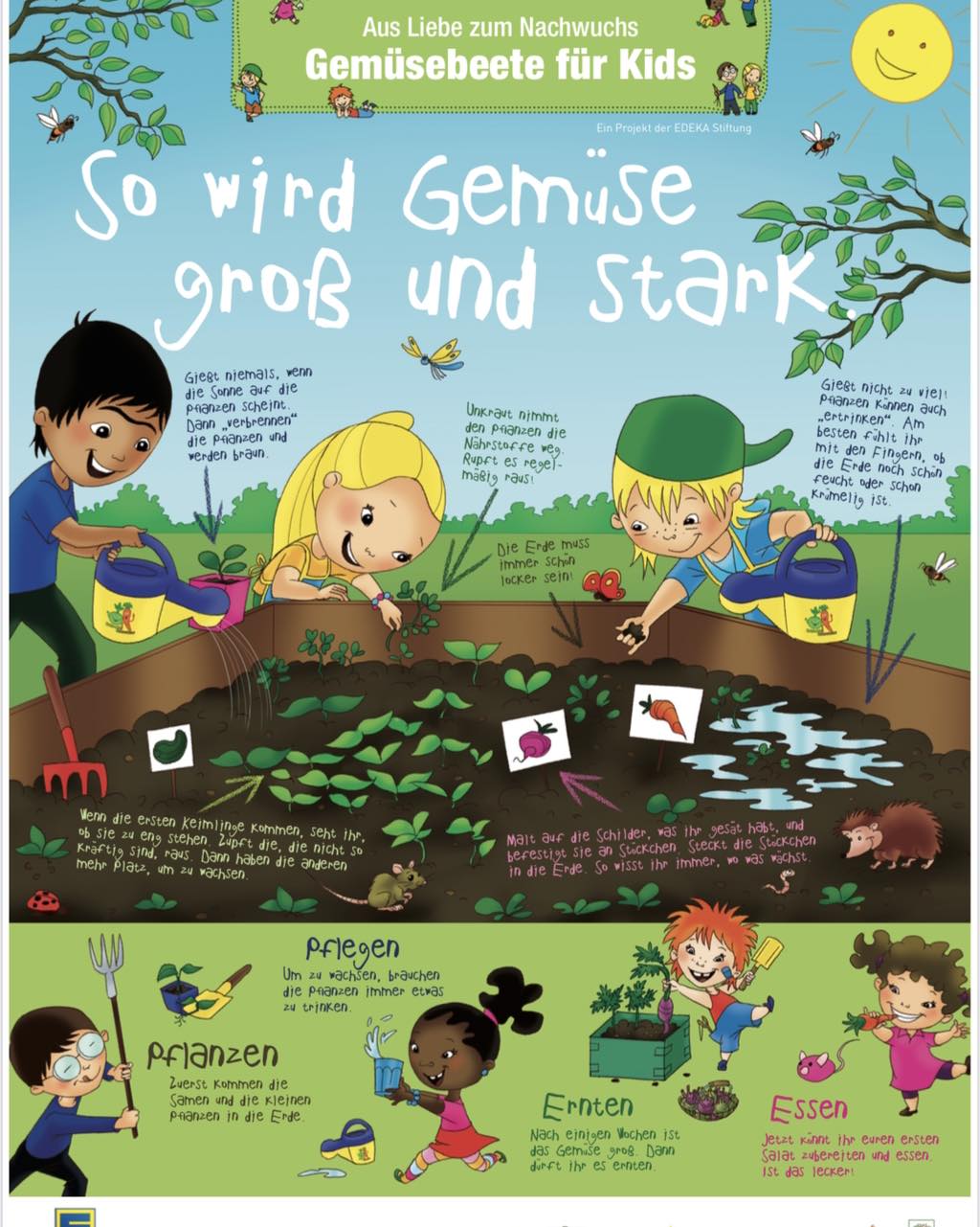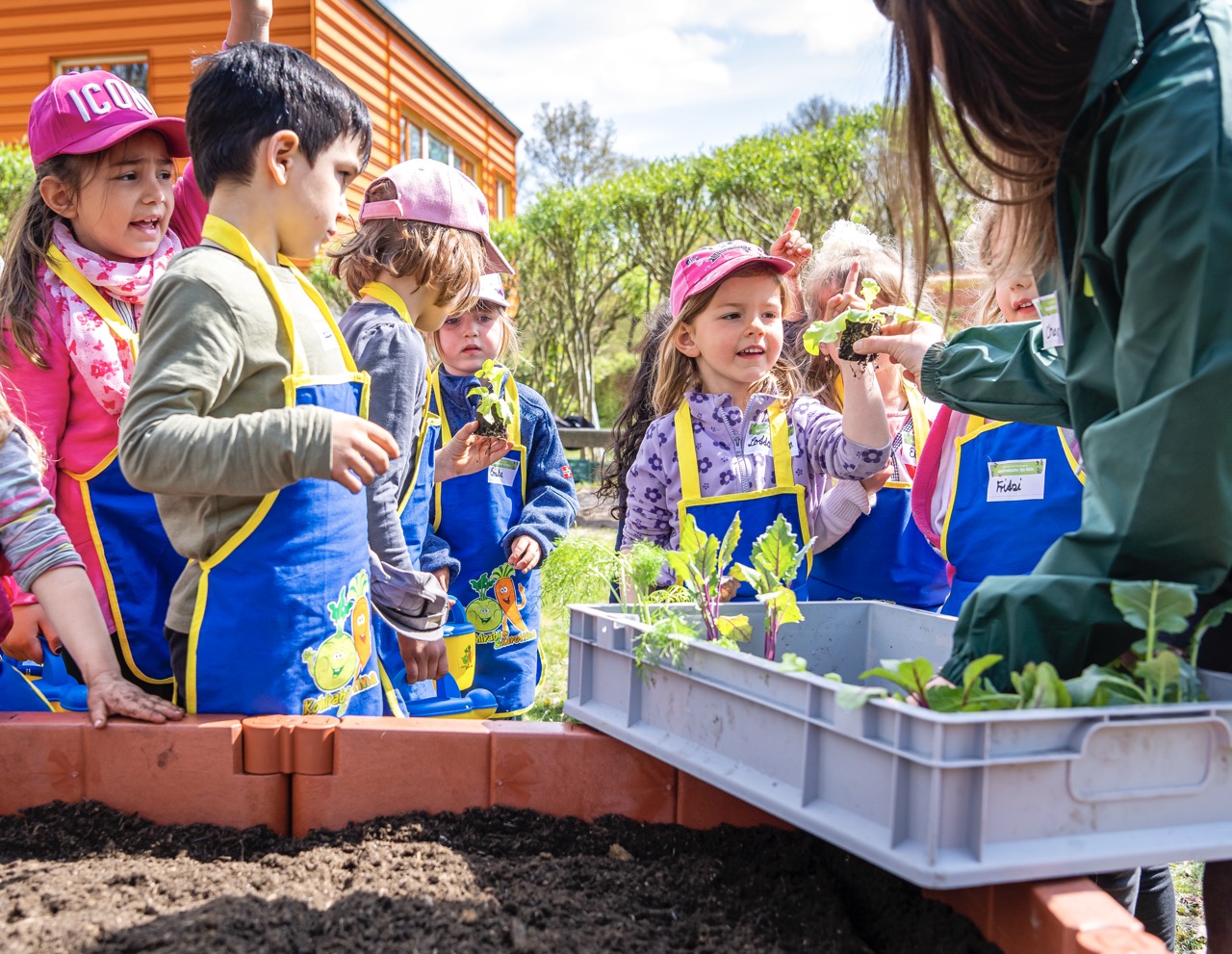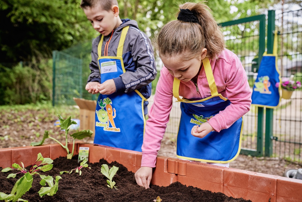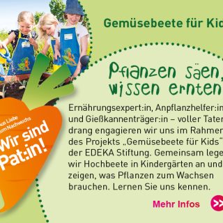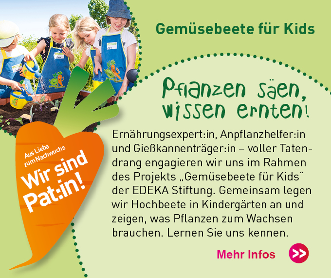 Wir finden: Theorie ist gut. Praxis ist unschlagbar – und die soll richtig Spaß machen: Bei unserem Projekt werden die Kinder selbst zu Gärtnern. Sie buddeln, harken, gießen und legen so, gemeinsam mit einem geschulten Team im Auftrag der EDEKA Stiftung, Gemüsehochbeete an. Die Kleinen übernehmen Verantwortung für ihr Beet. Und erhalten dazu Setzlinge, Pflanzensamen, Schürzen und Gießkannen sowie begleitende Lernmaterialien.