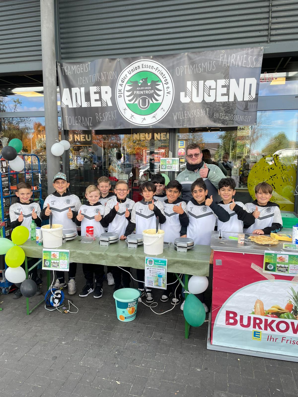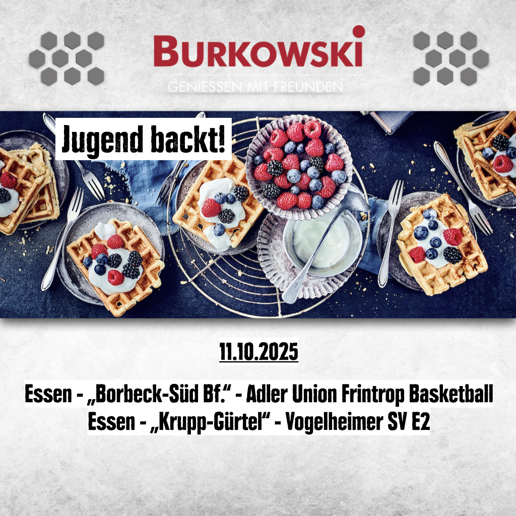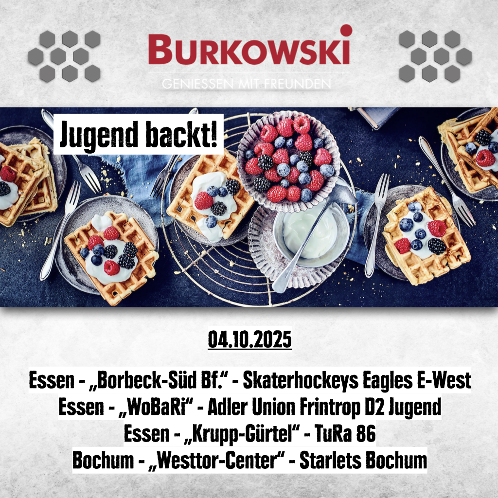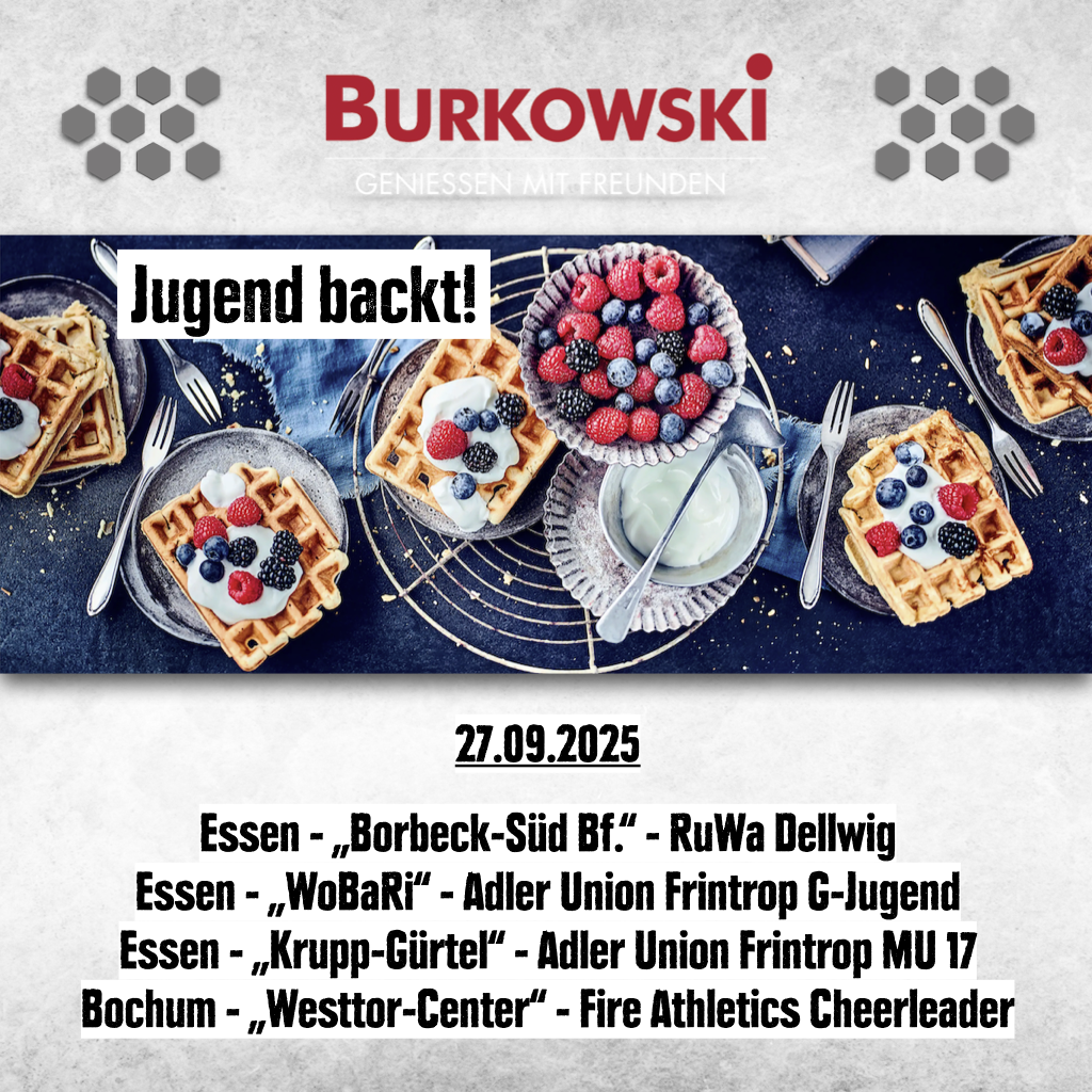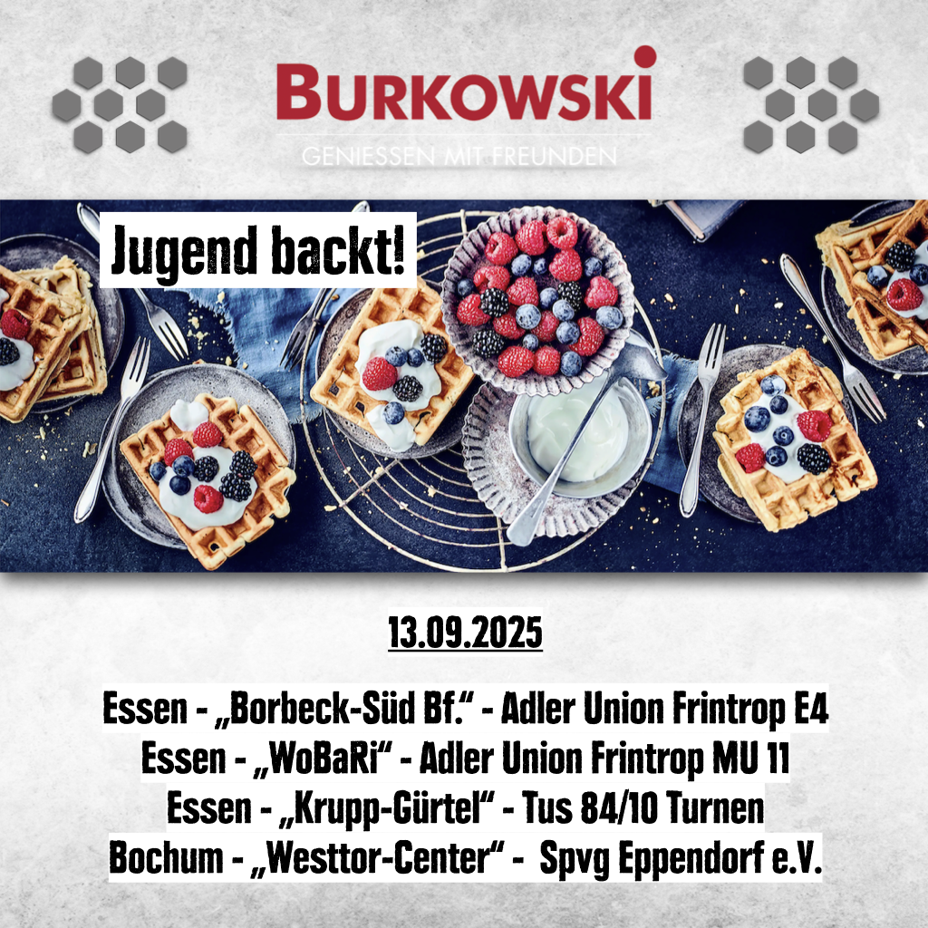 An einem Samstag im September/Oktober von 10:00 bis 18:00 Uhr vor einer unserer vier Frischecenter Burkowski Filialen in Essen & Bochum Waffeln verkaufen. Die Tageseinnahmen fließen in eure Mannschaftskasse.